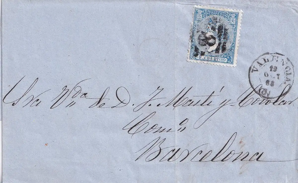 SPANIEN 1867 ISABELLA II 4 Cs/ Mi 81 BRIEF VALENCIA-BARCELONA