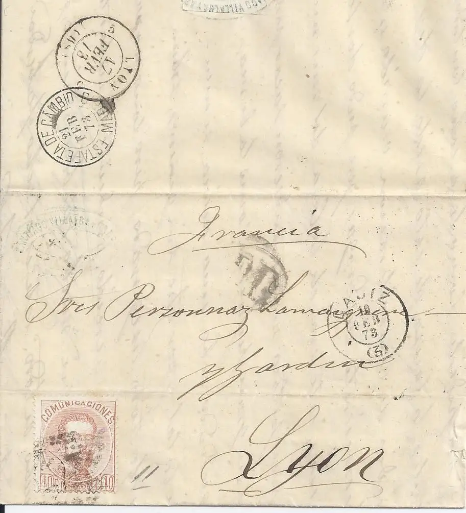 Spanien 1873, 40 C. auf Brief v. Cadiz n. Frankreich. #1409