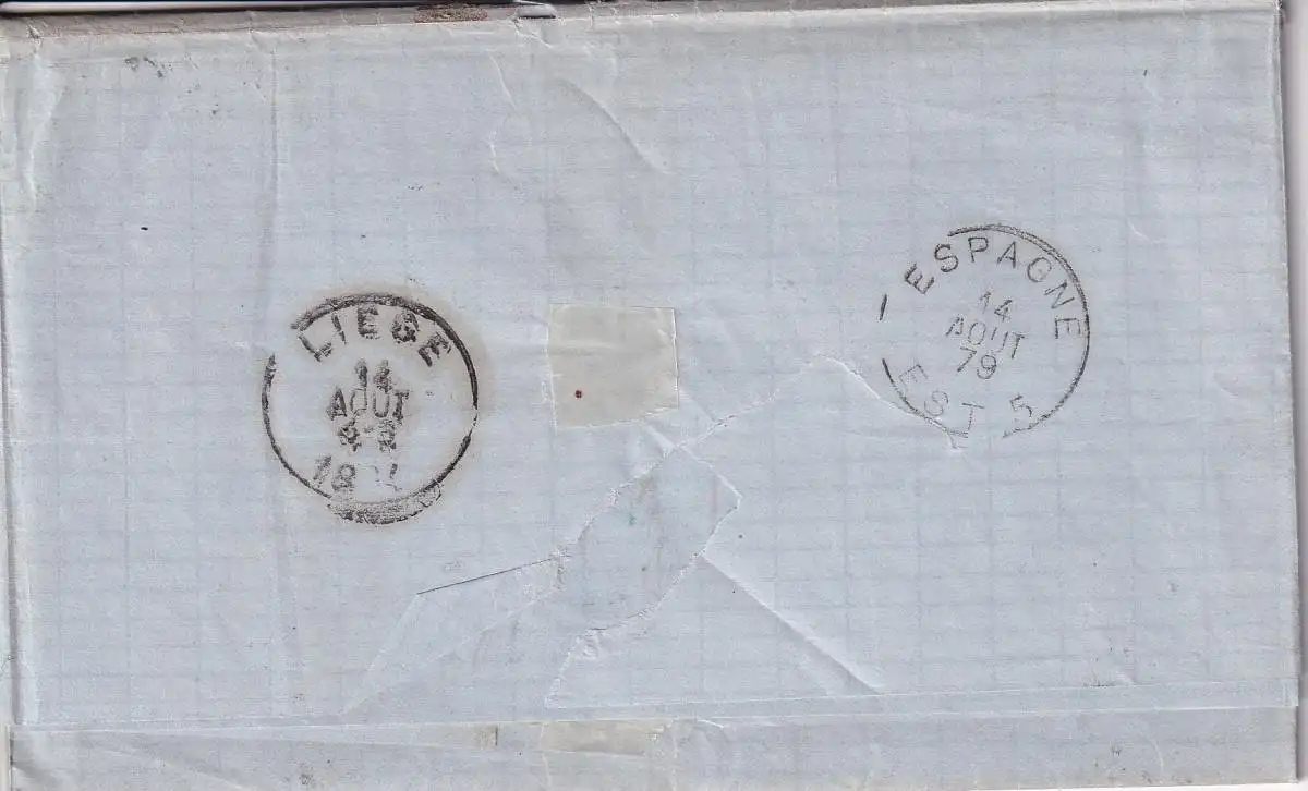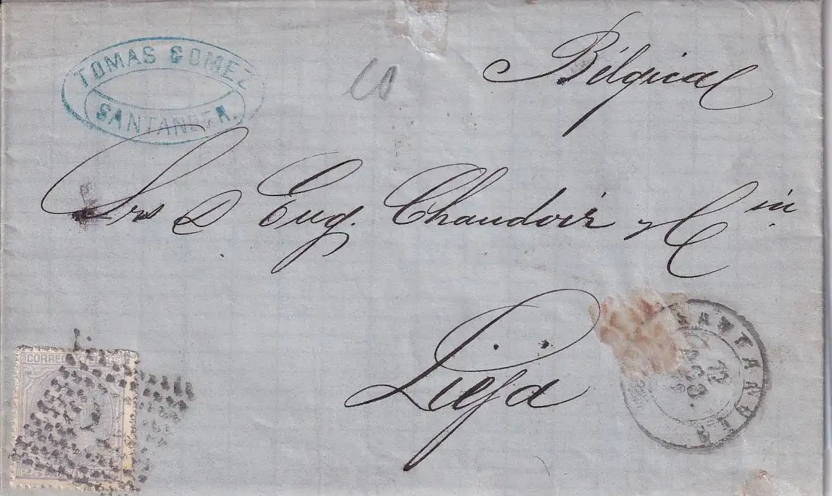 SPANIEN ESPANA 1879 25 C/ Mi 180 BRIEF CARTA SANTANDER-LIÈGE/ BELGICA