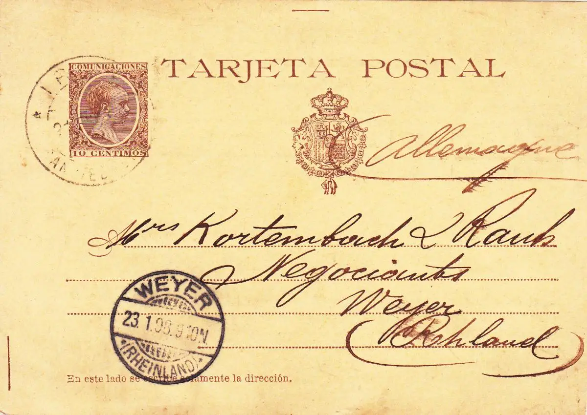 Spanien Pluspostkarte nach Weyer / Rheinland 1898