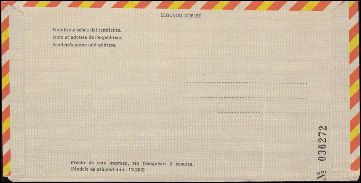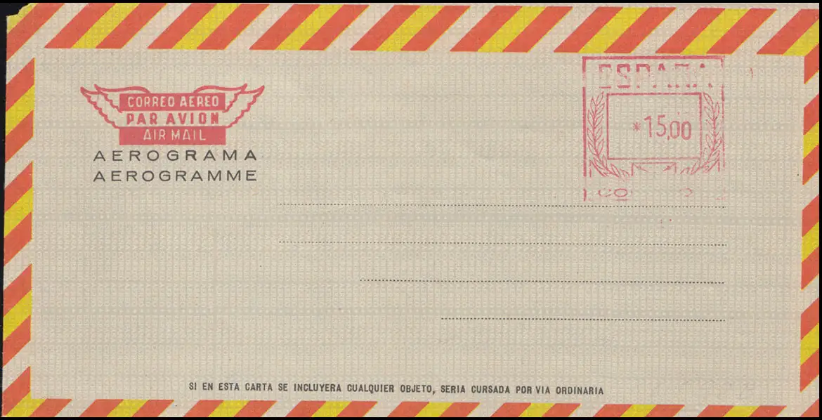 Spanien Luftpostfaltbrief LF 102 Freistempel 15,00 Ptas. ungebraucht, Eckfehler