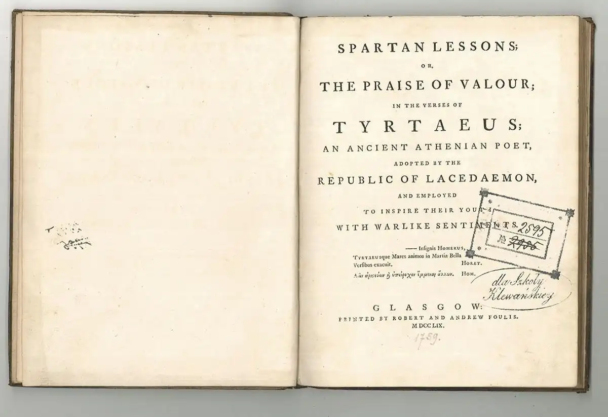 Bemerkungen: BM English Short Title Catalog, T136314 - Von James Moor (1712-1779), Professor für Griechisch and der Universität von Glasgow, mit einer biographischen Einleitung versehene Ausgabe der militärischen Lieder und Verse des Elegiendichters Tyrtaios (7. Jhdt. v. Chr.), die während des 2. Messensichen Krieges entstanden sein dürften. Die vorliegende seltene Ausgabe enthält eine gedruckte Widmung: "These remains of ancient panegyric on martial spirit and personal valour, of old, the daily lessons of the spartan youth, are, with propriety, inscribed to the young gentleman, lately, bred at the university of Glasgow, at present serving their country as officers of the Highland Battalions now in America". Mit 2 Kupferstich-Portraitmedaillons. Text in englischer und altgriechischer Sprache.