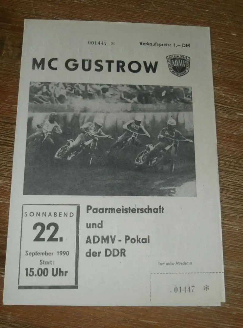 Speedway Güstrow 22.09.1990 , DDR Paarmeisterschaft + ADMV Pokal , Programmheft , Programm , Rennprogramm !!!