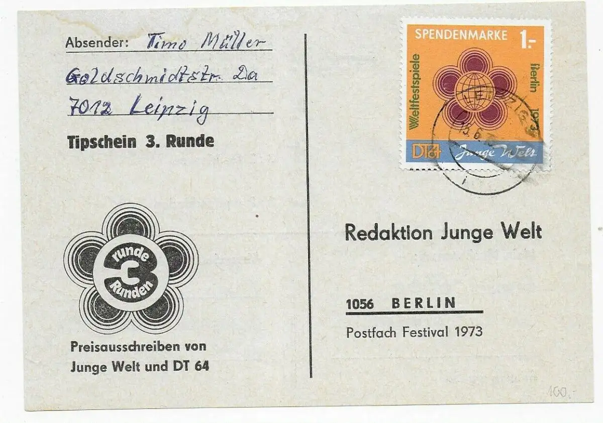 Spendenmarke: Weltfestspiele Berlin, Preisausschreiben Junge Welt, Leipzig