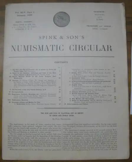 Titel: Spink & Son ' s Numismatic Circular. Vol. XLV. Part 1. January 1937. - Contents: The Rise and Fall of Classical Art as shown by Greek and Roman conis (P. Pennington); Notes on the Countries, Lordships and Fiefs of the Holy Roman Empire in Modern times (Owston Smith); Recent Medallic Works by the Swiss Sculptor Emil Wiederkehr; Isis Frestivals of the late Fourth Century A. D.; Numismatic Societies, Museum, etc; Publications Received; Catalogue of Coins and Medals for Sale: Greek Coins; Roman Coins; Continental Coins; A Choice Collection of Indian Gold Coins just purchased; Einglish Coins; British Imperial and Colonial Coins; War Medals and Decorations; Books on Numismatik; Advertisements and Notices;
