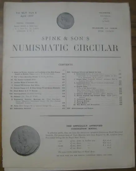 Titel: Spink & Son ' s Numismatic Circular. Vol. XLV. Part 4. April 1937. - Contents: Notes on Towns, Counties and Lordships of the Holy Roman Empire in Modern times (Oston Smith); New or Rare Byzantine Bronze (Davies Sherborn); The Capture of Banda Neira; Another Meal of Edward VIII; Edward VIII Coinage. East Africa; Portrait Plaque of T.M. King George VI and Queen Elizabeth; Three Medals ba G. V. Dionant; Correspondence; Obituary (P. H. Webb); Numismatic Societies, Meetings, etc; Publications Received; Catalogue of Coins and Medals for Sale: Greek Coins, Roman Coins, Continental Coins, English Coins, Colonial Gold Coins, British Imperail and Colonial Coins, Coronation Medals, Nautical Medals, Papal Medals, War Medals and Decorations; Advertisements and Notices;