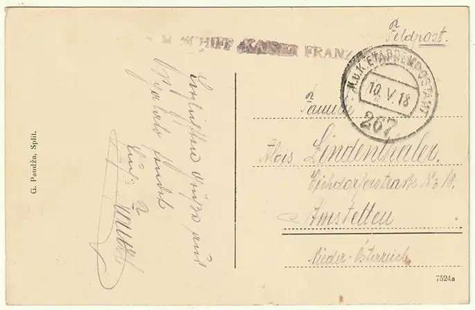 Bemerkungen: Gelaufen m. Stempel: S.M.Schiff Kaiser Fraanz Josef I. Schwarzer Einzeiler - KALIS 2-P. 35 neben K.u.K. Etappenpostamt/10. V. 18/267(Albanien - XIX. Korpskommando).