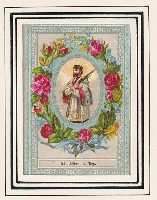 Bemerkungen: Dargestellt ist der Brückenheilige Johannes von Nepomuk (1350-1393) in einem Medaillon mit Rosen. In seinen Händen hält er ein Kruzifix und eine Märtyrerpalme. Johannes von Nepomuk erlitt sein Martyrium, indem er in die Moldau geworfen wurde. Vorangegangen war eine Auseinandersetzung mit König Wenzel und dem Prager Erzbischof Jenzenstein. Der Gedenktag der Heiligen Johannes von Nepomuk ist der 20. März. Verso mit typographischem Text und handschriftlicher (teils gelöschter) Widmung "Freundin Werafsky Anna".