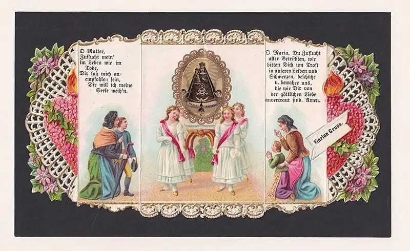 Bemerkungen: Das zentrale Bildfeld zeigt auf der Applikation das Gnadenbild `Maria Heil der Kranken` von Maria Enzersdorf, umgeben von vier `Kranzeljungfrauen`, die abgerundeten Seitenteile zeigen je eine betende Mutter mit Kind. Verso mit typographischem Text `Das Gebet der Kranzeljungfer` und handschriftlicher Notiz in Bleistift `Fr. Schinka. 14/4 05`.