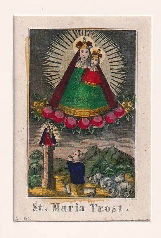 Bemerkungen: Dargestellt ist die um 1465 geschaffene Gnadenstatue aus der Grazer Basilika Mariatrost. Ursprünglich befand sie sich im Stift Rein. Darunter ist das Gnadenbild auf einem Sockel zu sehen, davor kniet ein Hirtenjunge. Im Hintergrund ist eine Schafherde zu sehen.
