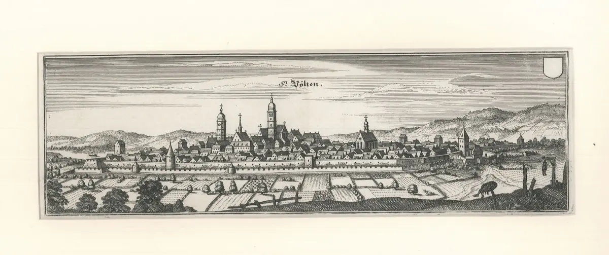 Bemerkungen: Nebehay-W. 407, 23b - Mit Galgen im Vordergrund. Kupferstich aus Matth. Merians "Topographia Provinciarum Austriacarum".