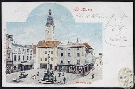 St. Pölten, Lud. Schubert [ca. 1900]. Farblithogr. Karte. Guter Zustand. Beidseit. beschrieb.