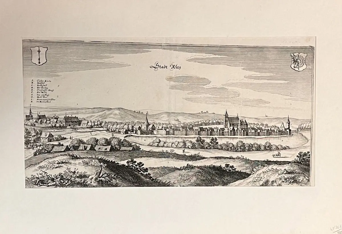 Bemerkungen: Ansicht der Stadt Reetz/Recz in der polnischen Woiwodschaft Westpommern von Matthäus Merian (1593-1650), wohl aus einer späteren, um 1703 erschienen Ausgabe der "Topographia Electoratus Brandeburgici". (S. 88; EA: 1652).