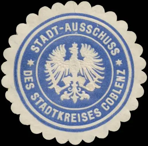 Stadt-Ausschuss, Coblenz, blau, weiß, geprägt, Größe/Zustand: 4 , guter Zustand, Original Verschluss-Siegelmarke aus Papier welche früher von Behörden, Firmen etc. zum Versiegeln der Briefe benutzt wurden