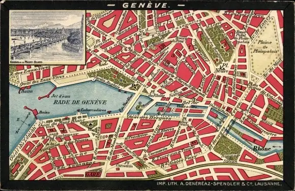 Stadtplan Ak Genf Stadt Schweiz, Panorama, Brücke, Mont Blanc, Place Neuve, Plaine de Plainpalais
