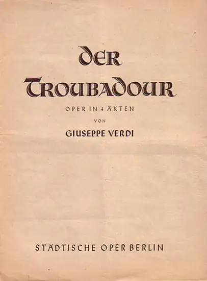 Städtische Oper Berlin. - Verdi, Giuseppe. - Pohl, Walter (Regie): Programmheft zu: Der Troubadour. Oper in 4 Akten. Regie: Walter Pohl. Bühnenbild: Janni Loghi. Musikalische Leitung: Hugo Diez. Chöre Ernst Senff. Darsteller: Hans Wocke, Liselotte Losch,