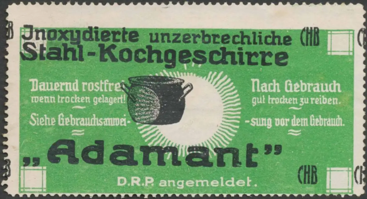 Inoxydierte unzerbrechliche Stahl Kochgeschirre Adamant, grün, Größe/Zustand: 4x8 , guter Zustand, Original alte Reklamemarke die seinerzeit für die Werbung benutzt wurde