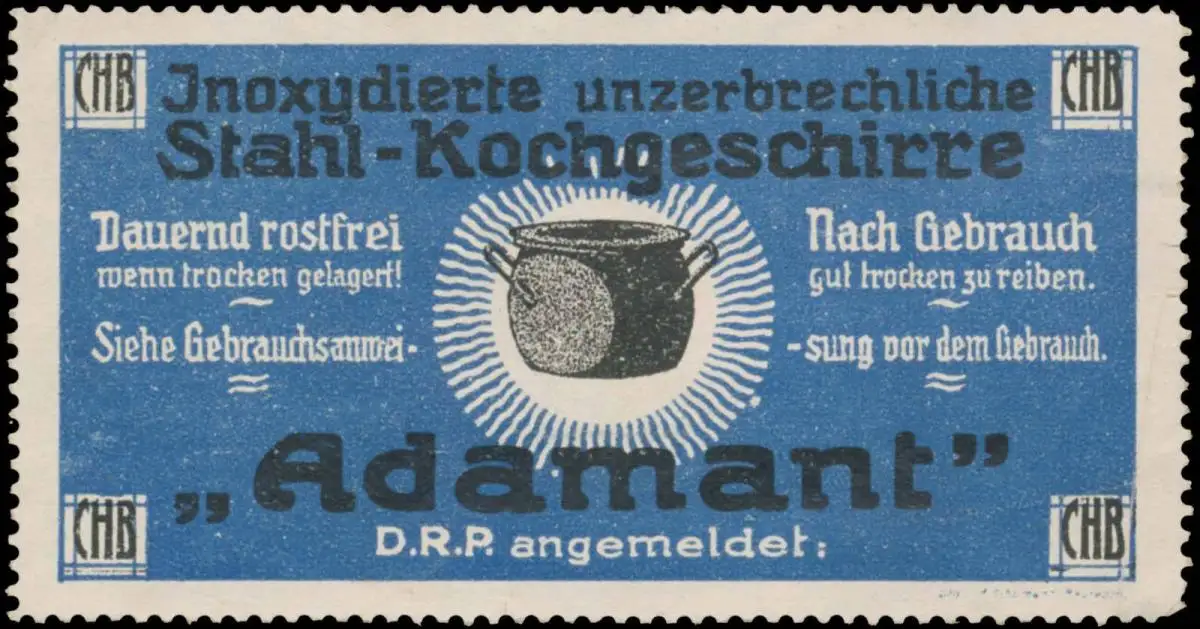 Inoxydierte unzerbrechliche Stahl Kochgeschirre Adamant, Größe/Zustand: 4x8 , guter Zustand, Original alte Reklamemarke die seinerzeit für die Werbung benutzt wurde