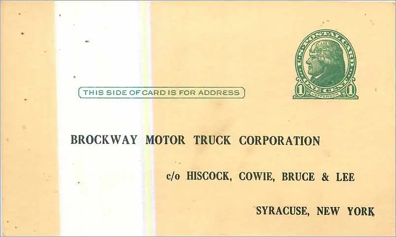 Stationay Etats-Unis 1c Brockway Motor Truc co Syracuse NY