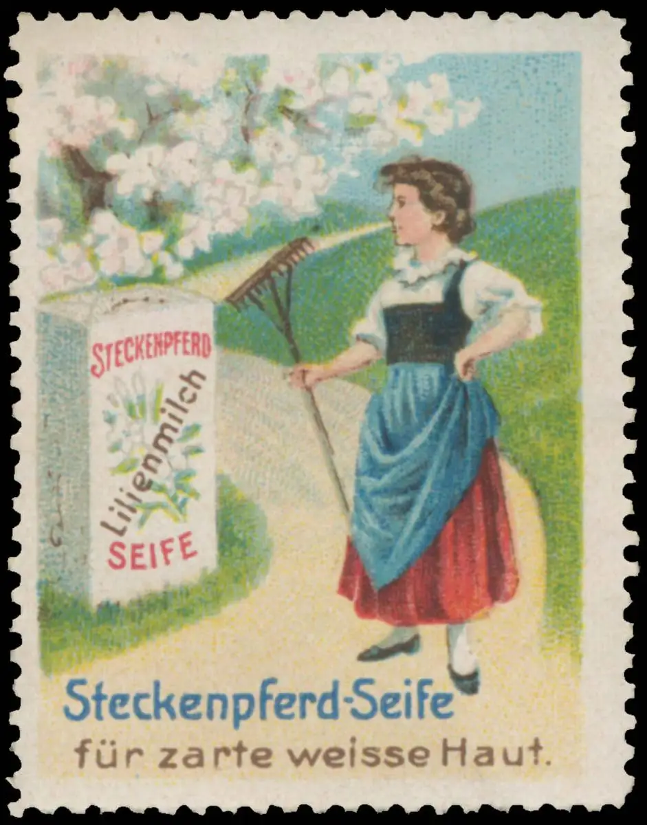 für zarte weisse Haut, Frau mit Harke , Größe/Zustand: 5x4 , guter Zustand, Original alte Reklamemarke die seinerzeit für die Werbung benutzt wurde
