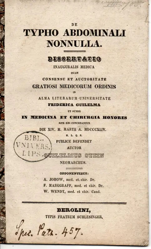 Stein, Wilhelm: aus Tornow/Neumünster: De typho abdominali nonnulla. Dissertation.