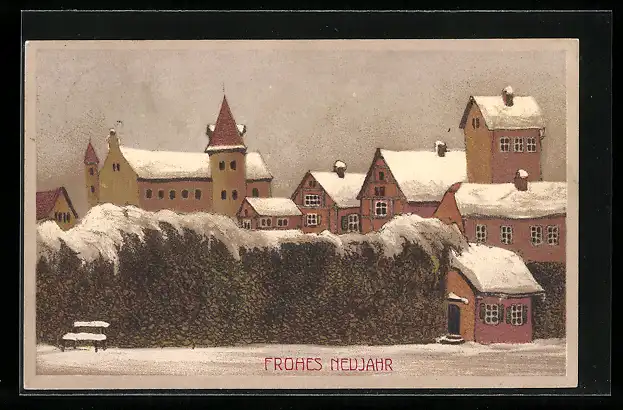 Steindruck-AK Alte Häuser im Schnee, Frohes Neujahr