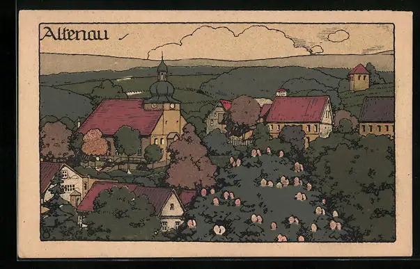 Steindruck-AK Altenau, Teilansicht mit Kirche