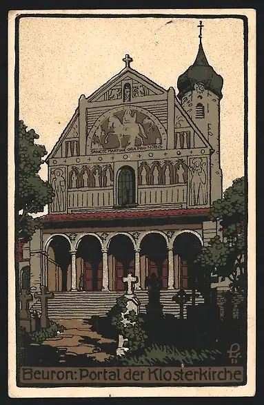 Steindruck-AK Beuron, Portal der Klosterkirche, Friedhof