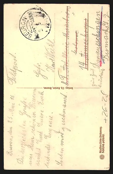 Personenbezogene Daten auf der Rückseite der Karte wurden durch blauen Textmarker unkenntlich gemacht. Die blauen Stellen sind auf die Vorderseite durchgeweicht und wirken sich negativ auf das Postkartenfoto aus