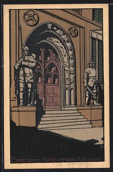 Steindruck-AK Bremen, Ritter vor dem Rathause