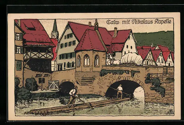 Steindruck-AK Calw, Flösser unterqueren eine Steinbrücke, Nikolaus Kapelle