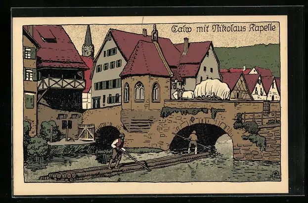Steindruck-AK Calw, Ortspartie mit Nikolauskapelle und Floss