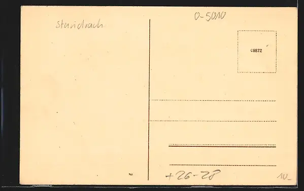 Personenbezogene Daten auf der Rückseite der Karte wurden durch blauen Textmarker unkenntlich gemacht. Die blauen Stellen sind auf die Vorderseite durchgeweicht und wirken sich negativ auf das Postkartenfoto aus