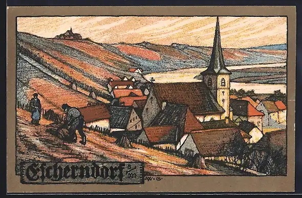 Steindruck-AK Escherndorf, Teilansicht mit Kirche und Bauern