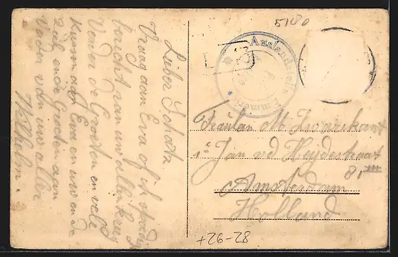 Personenbezogene Daten auf der Rückseite der Karte wurden durch blauen Textmarker unkenntlich gemacht. Die blauen Stellen sind auf die Vorderseite durchgeweicht und wirken sich negativ auf das Postkartenfoto aus