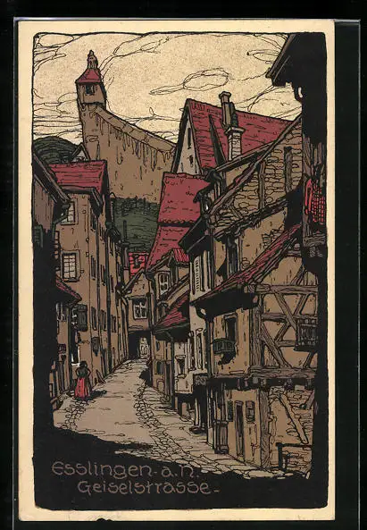 Steindruck-AK Esslingen a. N., Blick auf die Geiselstrasse