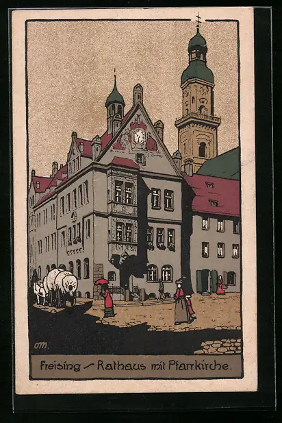 Steindruck-AK Freising, Rathaus mit Pfarrkirche