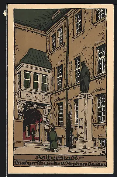 Steindruck-AK Halberstadt, Landgericht und Eyke von Repkow Denkmal