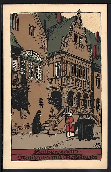 Steindruck-AK Halberstadt, Rathaus mit Ratslaube
