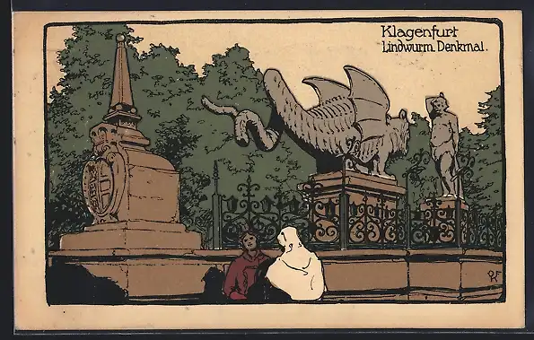 Steindruck-AK Klagenfurt, Lindwurm-Denkmal, Leute