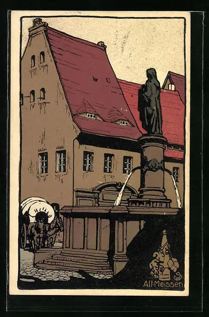Steindruck-AK Meissen, Ortspartie an einem Brunnen in Alt-Meissen