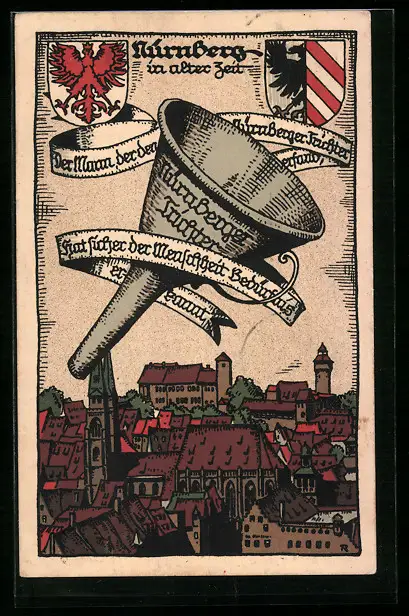 Steindruck-AK Nürnberg, Stadtansicht mit Nürnberger Trichter