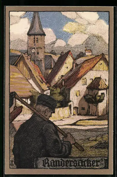 Steindruck-AK Randersacker a. M., Bauer mit Hacke auf einer Strasse