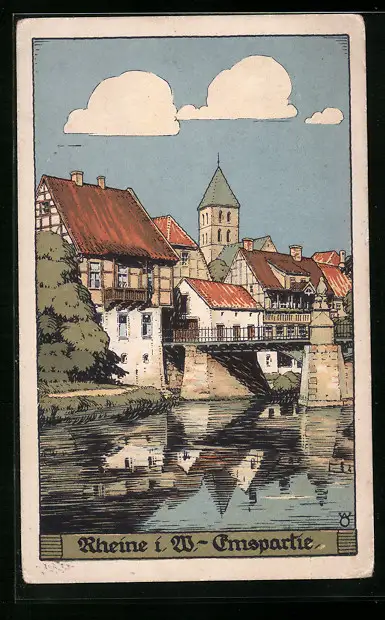 Steindruck-AK Rheine i. W., Emspartie mit Kirche
