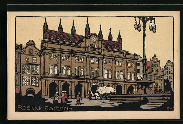 Steindruck-AK Rostock, Rathaus mit Brunnen