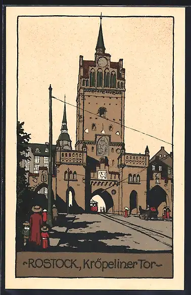 Steindruck-AK Rostock, Strassenbahn fährt durch das Kröpeliner Tor