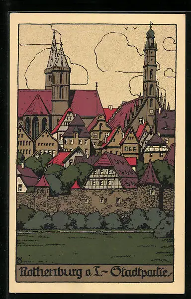 Steindruck-AK Rothenburg o. T., Stadtpartie