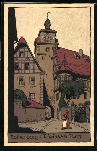 Steindruck-AK Rothenburg o. T., Weisser Turm mit Torbogen