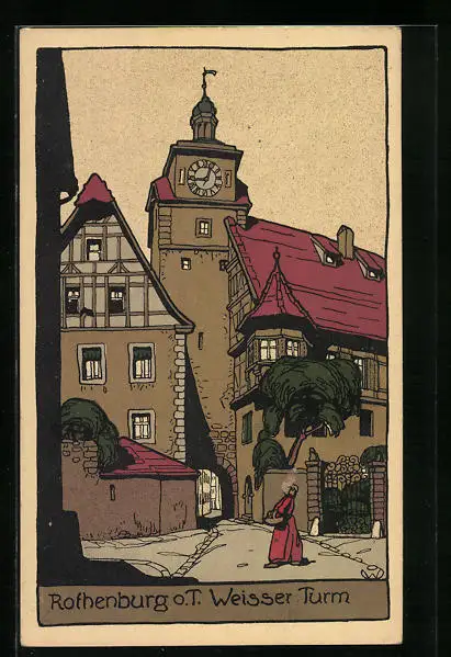 Steindruck-AK Rothenburg o. T., Weisser Turm und Frau mit Korb