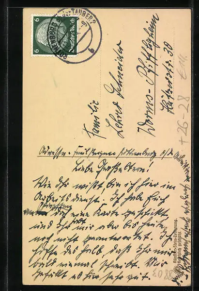 Personenbezogene Daten auf der Rückseite der Karte wurden durch blauen Textmarker unkenntlich gemacht. Die blauen Stellen sind auf die Vorderseite durchgeweicht und wirken sich negativ auf das Postkartenfoto aus